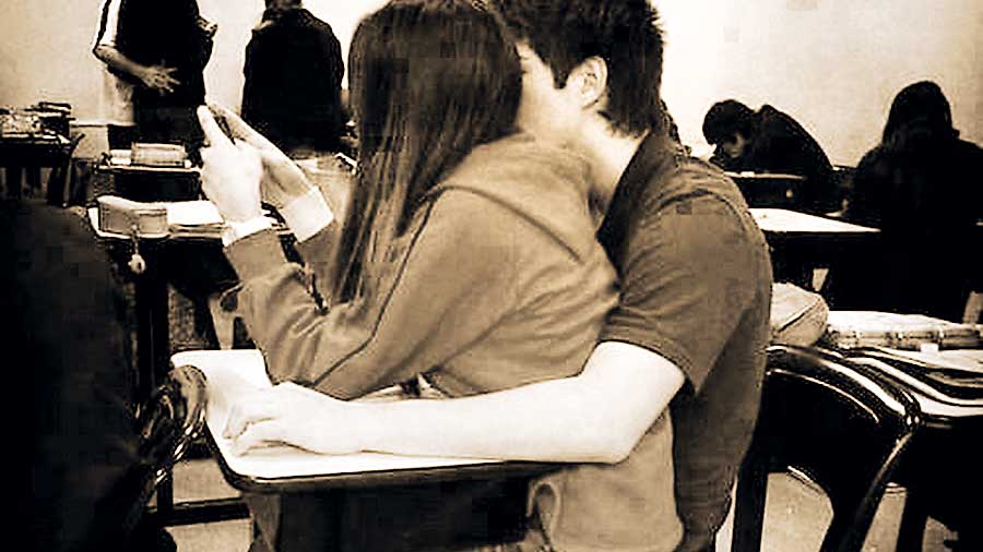 පියගැට පෙළක් අතර වූ ස්ථානයකි. අවට පසුබිමේ සමර ඇතිරූ බිත්තියකි. එහි පාමුල යොවුන් වියේ පසුවන දැරියන් දෙදෙනකු සහ යොව...
